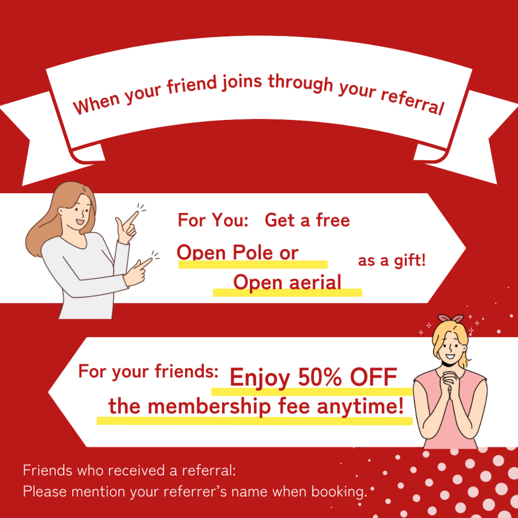 * Friend Referral Program! Refer your friend and their membership fee will be reduced to 6,600 yen. Once they have registered, you will also receive a 1,000 yen discount ticket that can be used for any of our classes (valid for 1 month)