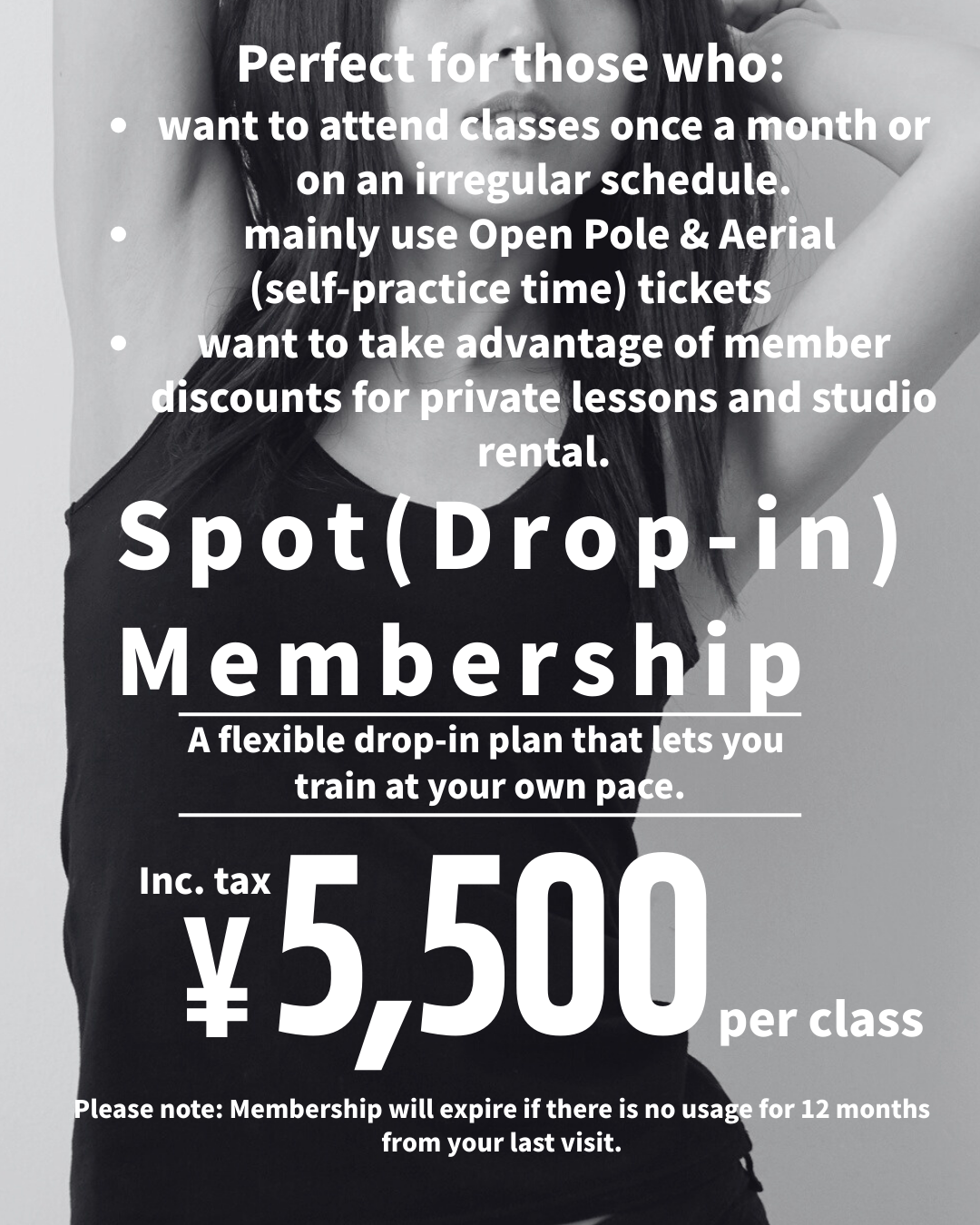 As a member, you can enjoy the same member benefits as monthly members, including member pricing for private lessons, studio rentals, and Open Pole & Aerial sessions. You can also purchase Open Pole & Aerial tickets, which are available only to members.