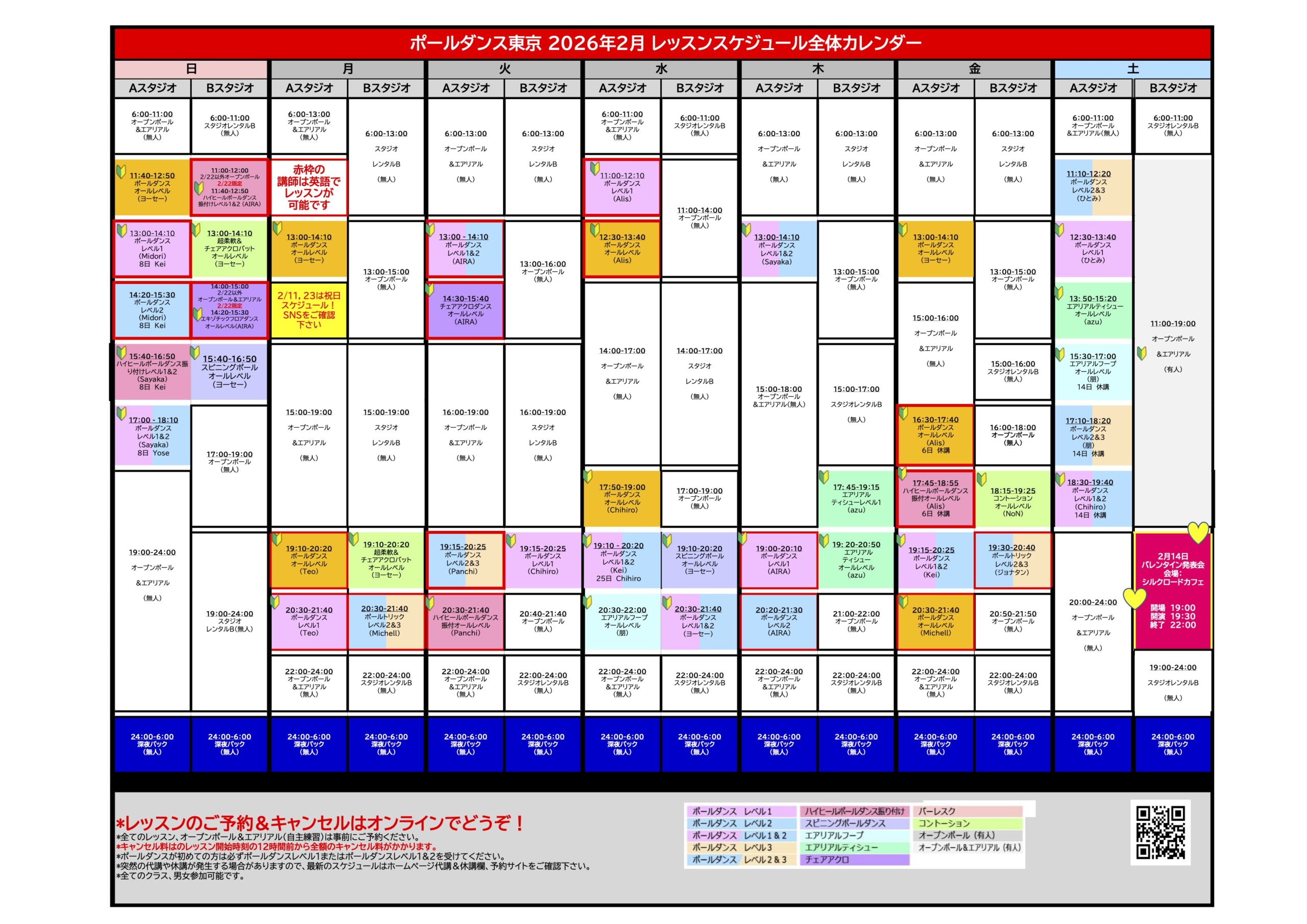 レッスンは一回ごとのお支払い、またはチケット制です。お好きなレッスンを自由にいつでも受講可能です。月謝の縛りもございません。レベル表記については、レベル1=超初心者、レベル2=初級&初中級レベル、レベル3=中級&上級レベル、となっております。レベル1&2、2&3は、それぞれのレベルの方を一緒のクラスでレッスンを行いますが、講師が各自のレベルに合わせますのでレベル1の方も安心してご参加ください。