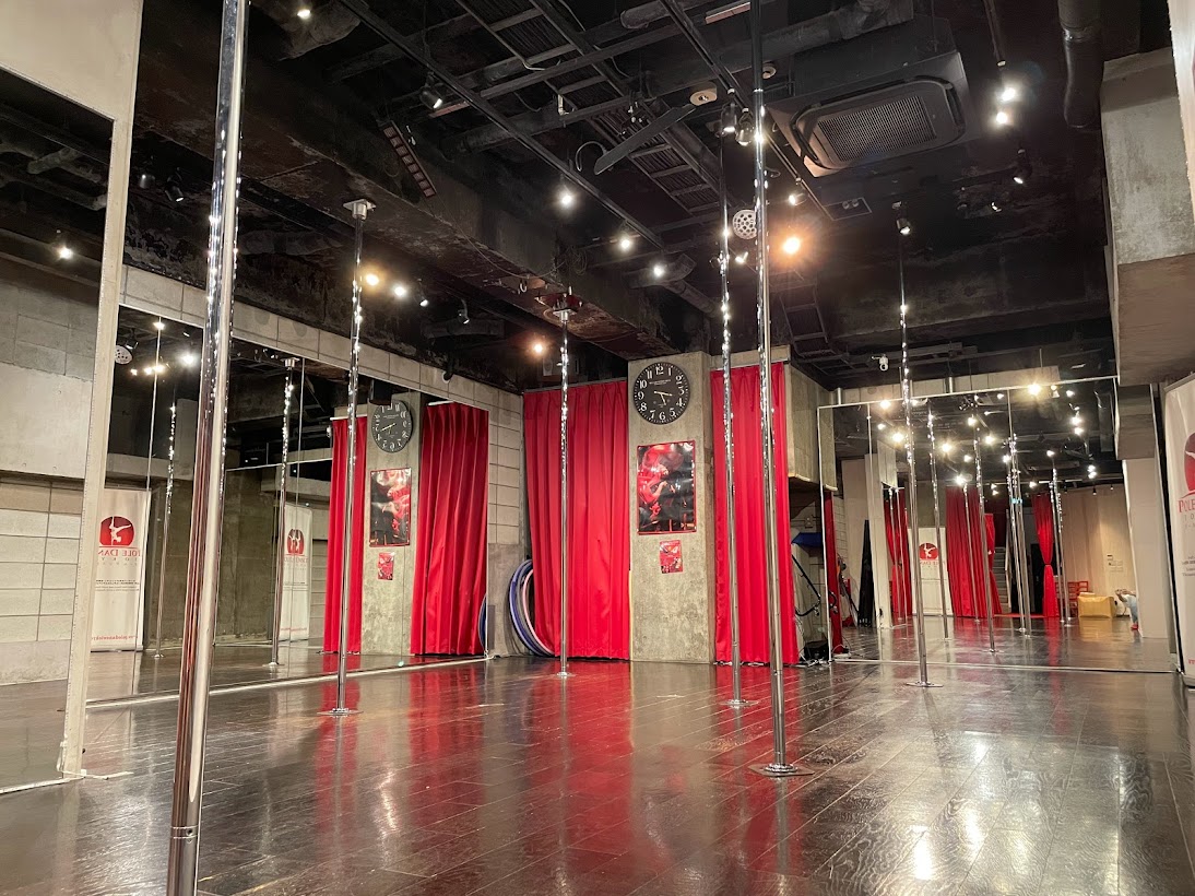 広さ100平米、天井4m&3m、ポールは10本、エアリアルフックは2点が常設です。(別途スタッフ料金にてポールは最大12本まで、エアリアル釣り点最大4点まで追加が可能です。)エアリアルティシュー、エアリアルフープ、安全マット、オーディオ、鏡、ヨガマット、ヨガブロックが利用料金に含まれます。