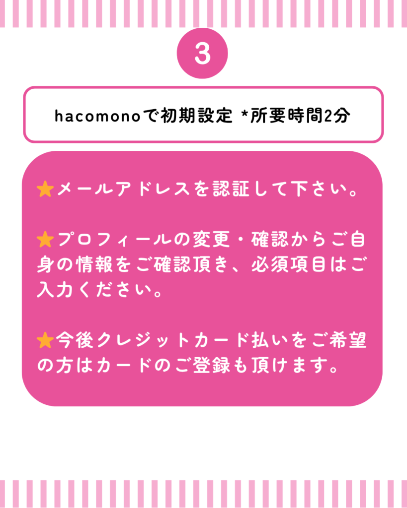 | ③ 初期設定(メールアドレス認証、プロフィール確認&記入、クレジットカード登録(任意)) |