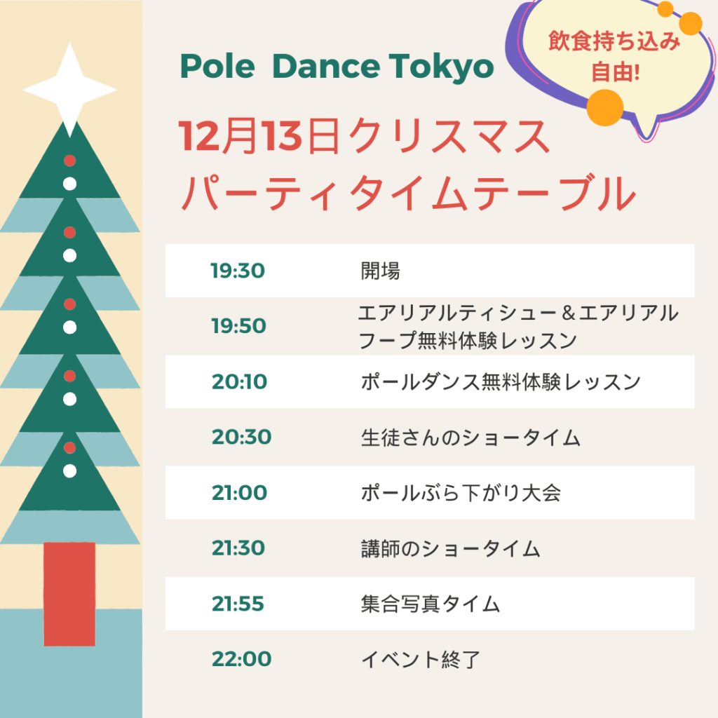 POLE DANCE TOKYO クリスマスパーティ開催🎄🎄🎅✨とっても楽しいポールダンス東京クリスマスパーティ!どなたでもご参加いただけます。ポールぶら下がり選手権、無料体験レッスン、生徒さんや先生のショーも満載、新しいお友達作りや、いつもの仲間と楽しくパーティしましょう!