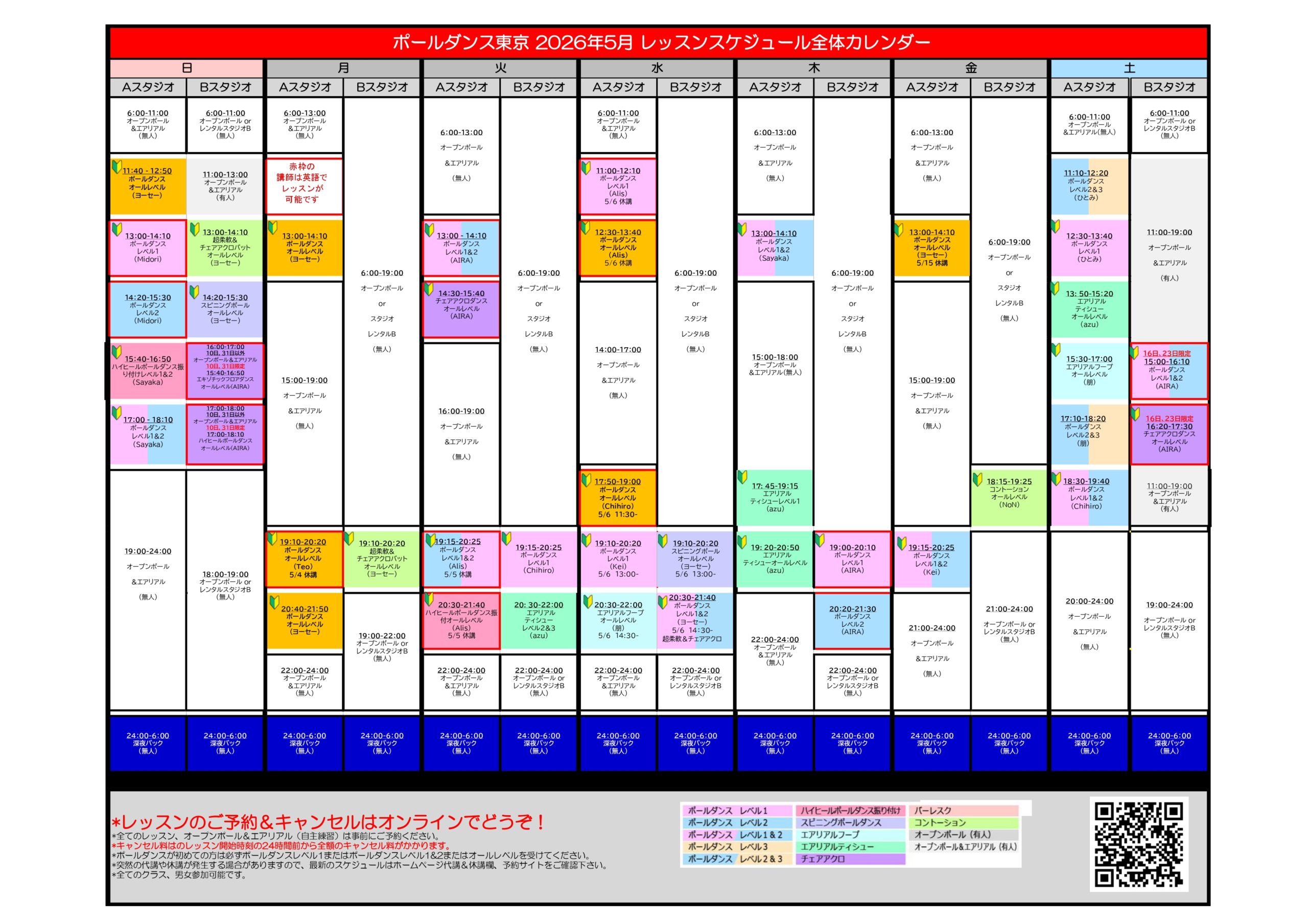 レベル1=初心者、レベル2=初中級、レベル3=中級&上級レベル、となっております。レベル1&2、2&3、オールレベルは、それぞれのレベルの方を一緒のクラスでレッスンを行いますが、講師が各自のレベルに合わせてレッスンを行いますので安心してご参加ください。 2026年4月のレッスンスケジュール レッスン予約はこちら 2026年5月のレッスンスケジュール レッスン予約はこちら